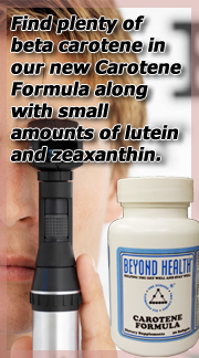 converts in the body as needed into vitamin A. Two other antioxidant carotenoids that have been getting a lot of attention recently are lutein and zeaxanthin. The only two carotenoids found specifically concentrated in the retina (and especially in the macula of the retina) and in the lens, these pigments appear to be largely responsible for protecting the eyes from the oxidizing effects of ultraviolet and blue light and other free radical damage. You’ll find plenty of highly bioavailable beta carotene in our new Carotene Formula along with small amounts of lutein and zeaxanthin. In addition, anyone following the Beyond Health lifestyle, including consuming plenty of fruits and vegetables, will automatically be getting lots of lutein and zeaxanthin from their diet.